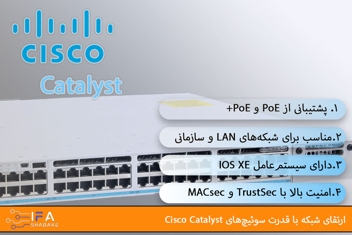 در مقابل Nexus، سری Catalyst بیشتر برای شبکه‌های LAN، دفاتر سازمانی، شعبات و محیط‌های صنعتی طراحی شده است. این سوئیچ‌ها قابلیت‌های امنیتی بالا، تغذیه برق از طریق PoE و امکانات مدیریتی کامل را فراهم می‌کنند. ویژگی‌های اصلی: